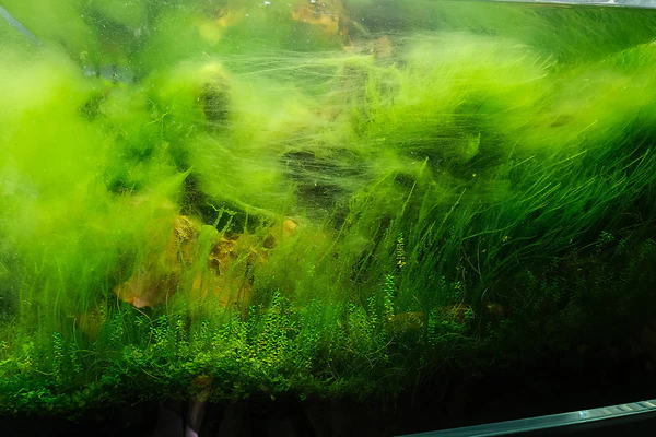 Pokud vaše nádrž vypadá jako na obrázku níže, APT FIX / APT FIXLITE nepřinese žádnou viditelnou / významnou změnu. Můžete použít algicid na bázi mědi, který skutečně zničí všechny řasy. Zničí však také bakteriální kolonii v nádrži a ostatní rostliny. Pro takovou nádrž doporučujeme reset.