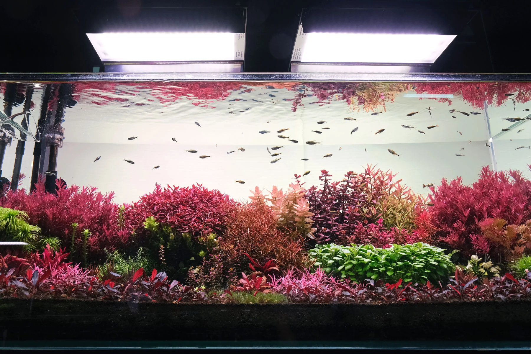 Sytě červené barvy z našich dvouhodinových nádrží pocházejí z kombinace vysoké úrovně osvětlení (200 µmol PAR u substrátu), omezení dusičnanů ve vodním sloupci a udržování dlouhodobé stability nádrže.